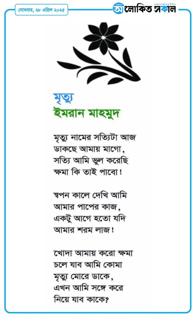 হোম / কবিতা / নিবন্ধকবিতা :”মৃত্যু” ইমরান মাহমুদ , ভাওয়াল বদরে আলম সরকারি কলেজ প্রকাশ: ২৮ এপ্রিল ২০২৫ পাঠ: ৩৫ বার .লেখক: সদস্য, জাতীয় বিশ্ববিদ্যালয়।এই লেখাটি ২৮ এপ্রিল ২০২৫ তারিখে দৈনিক আলোকিত সকাল পত্রিকায় প্রকাশিত। লেখাটি শেয়ার করুন: