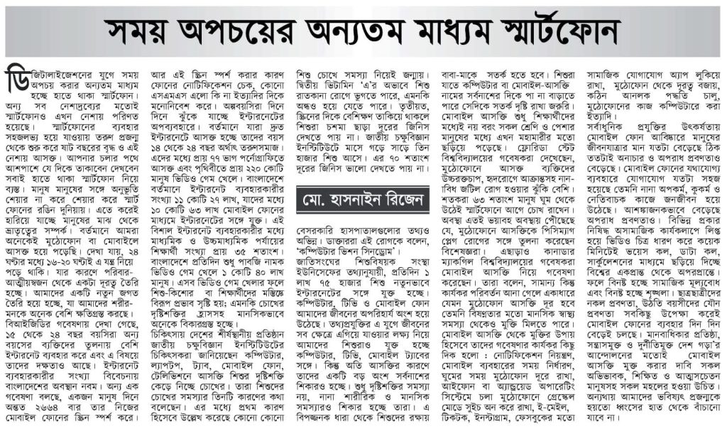 ডিজিটালাইজেশনের এই যুগে আমরা যেটা সবচেয়ে বেশি অপচয় করি সেটা হচ্ছে সময়। আর এই সময় অপচয় করার অন্যতম মাধ্যম হচ্ছে হাতে থাকা স্মার্টফোন। অন্য সকল নেশা দ্রব্যের মতোই স্মার্টফোন ও এখন নেশায় পরিণত হয়েছে। স্মার্টফোনের ব্যবহার সহজলভ্য হয়ে যাওয়ায় তরুণ প্রজন্ম থেকে শুরু করে ষাট বছরের বৃদ্ধ ও এই নেশায় আসক্ত। আপনার চলার পথে আশে পাশে যে দিকে তাকাবেন দেখবেন সবাই হাতে থাকা স্মার্টফোন নিয়ে ব্যস্ত। মানুষ মানুষের সাথে অনুভূতি শেয়ার না করে শেয়ার করে স্মার্ট ফোনের রঙিন দুনিয়ায়। এতে করেই হারিয়ে যাচ্ছে মানুষের মাঝে থেকে ভ্রাতৃত্বের সম্পর্ক।বর্তমানে আমরা অনেকেই মুঠোফোন বা মোবাইলে আসক্ত হয়ে পড়েছি। দেখা যায়, ২৪ ঘণ্টার মধ্যে ১৬-২০ ঘণ্টাই এ যন্ত্র নিয়ে পড়ে থাকি। যার কারণে পরিবার-আত্মীয়স্বজন থেকে একটা দূরত্ব তৈরি হচ্ছে। আমাদের একটি নতুন জগত তৈরি হয়ে হচ্ছে, যা আমাদের শরীর-মনকে অনেক বেশি ক্ষতিগ্রস্ত করছে।