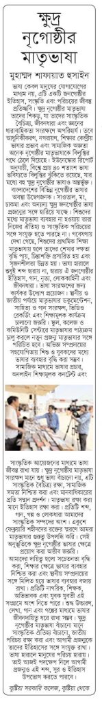 অন্তর্ভুক্ত। মাধ্যম নয়, এটি একটি জনগোষ্ঠীর ইতিহাস, সংস্কৃতি এবং পরিচয়ের জীবন্ত প্রতিচ্ছবি। ক্ষুদ্র নৃগোষ্ঠীর মাতৃভাষা তাদের শিকড়, যা তাদের সাংস্কৃতিক বৈচিত্র্য, জীবনধারা এবং জ্ঞানের ধারাবাহিকতা সংরক্ষণে অপরিহার্য। তবে আধুনিকীকরণ, নগরায়ণ, শিক্ষার কেন্দ্রীয় ভাষার প্রভাব এবং সামাজিক অজ্ঞতা অনেক নৃগোষ্ঠীর মাতৃভাষাকে বিলুপ্তির পথে ঠেলে দিয়েছে। ইউনেস্কোর রিপোর্ট অনুযায়ী, বিশ্বে প্রায় ৪০ শতাংশ ভাষা ভবিষ্যতে বিলুপ্তির ঝুঁকিতে রয়েছে, যার মধ্যে বহু ক্ষুদ্র নৃগোষ্ঠীর ভাষাও অন্ত বাংলাদেশের বিভিন্ন নৃগোষ্ঠীর ভাষার অবস্থা উদ্বেগজনক। সাওতাল, মং, চাকমা এবং অন্যান্য ক্ষুদ্র জনগোষ্ঠীর ভাষা প্রজন্মের সঙ্গে হারিয়ে যাচ্ছে। শিশুদের মধ্যে মাতৃভাষা ব্যবহার না হওয়ায় তারা নিজের ঐতিহ্য ও সাংস্কৃতিক পরিচয়ের সঙ্গে সংযুক্ত হতে পারছে না। গবেষণায় দেখা গেছে, শিশুদের প্রাথমিক শিক্ষা মাতৃভাষায় হলে তাদের শেখার দক্ষতা বৃদ্ধি পায়, চিন্তাশক্তি প্রসারিত হয় এবং সৃজনশীলতা উন্নত হয়। ভাষা হারালে শুধুই শব্দ হারায় না, হারায় ঐ জনগোষ্ঠীর ইতিহাস, গান, নৃত্য, লোককাহিনী এবং ভাষা কেবল মানুষের যোগাযোগের জীবনধারা। ভাষা সংরক্ষণের জন্য কার্যকর উদ্যোগ প্রয়োজন। স্থানীয় ও জাতীয় পর্যায়ে মাতৃভাষার ডকুমেন্টেশন, সংরক্ষণ ভিডিও সাহিত্য ও গান সংরক্ষণ, রেকর্ডিং এবং শিক্ষামূলক কার্যক্রম চালানো জরুরি। স্কুল, কলেজ ও কমিউনিটি সেন্টারে মাতৃভাষার পাঠ্যক্রম চালু করলে নতুন প্রজন্ম মাতৃভাষার সঙ্গে পরিচিত হবে। অভিজ্ঞ সম্প্রদায়ের সহযোগিতায় শিশু ও যুবকদের মধ্যে ভাষার ব্যবহার বৃদ্ধি করা সম্ভব। সামাজিক মাধ্যমে ভাষার প্রচার, অনলাইন শিক্ষামূলক কনটেন্ট এবং