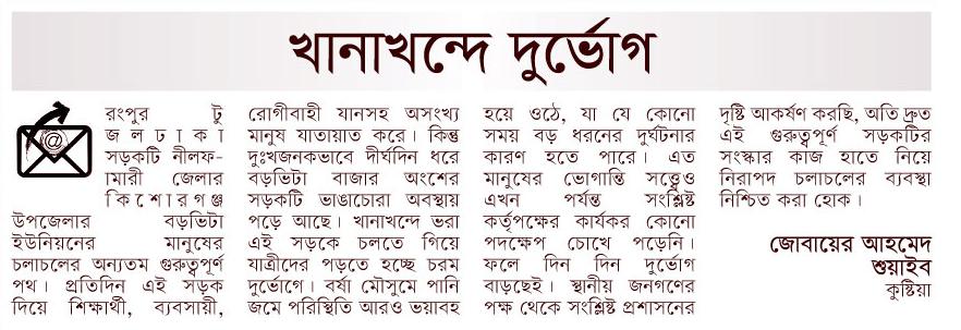 হোম / কর্তৃপক্ষের দৃষ্টি আকর্ষণ / নিবন্ধখানাখন্দে দুর্ভোগ মো জোবায়ের আহমেদ শুয়াইব , ইসলামী বিশ্ববিদ্যালয়, কুষ্টিয়া প্রকাশ: ২৪ জানুয়ারি ২০২৬ পাঠ: ৪৬ বার খানাখন্দে দুর্ভোগলেখক: সহযোগী সদস্য, ইসলামী বিশ্ববিদ্যালয়।এই লেখাটি ২৪ জানুয়ারি ২০২৬ তারিখে দৈনিক জনকন্ঠ পত্রিকায় প্রকাশিত। লেখাটি শেয়ার করুন: