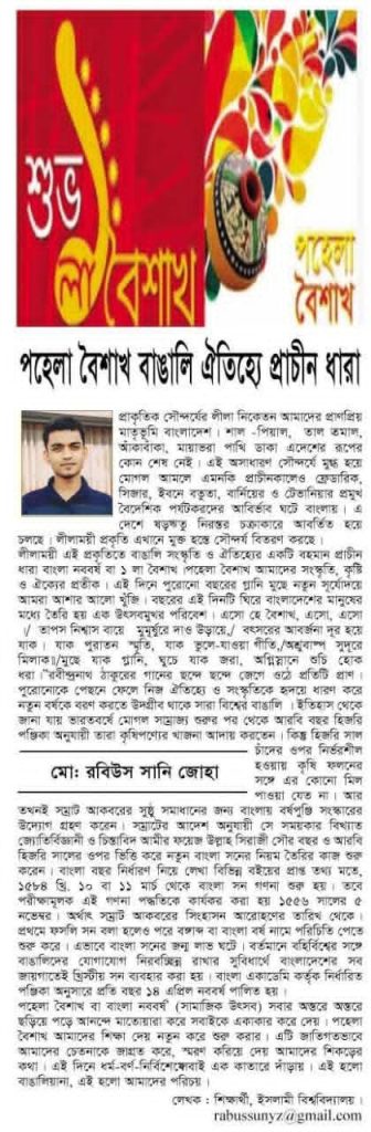লীলাময়ী এই প্রকৃতিতে বাঙালি সংস্কৃতি ও ঐতিহ্যের একটি বহমান প্রাচীন ধারা বাংলা নববর্ষ বা ১ লা বৈশাখ।পহেলা বৈশাখ আমাদের সংস্কৃতি, কৃষ্টি ও ঐক্যের প্রতীক। এই দিনে পুরোনো বছরের গ্লানি মুছে নতুন সূর্যোদয়ে আমরা আশার আলো খুঁজি। বছরের এই দিনটি ঘিরে বাংলাদেশের মানুষের মধ্যে তৈরি হয় এক উৎসবমুখর পরিবেশ।
