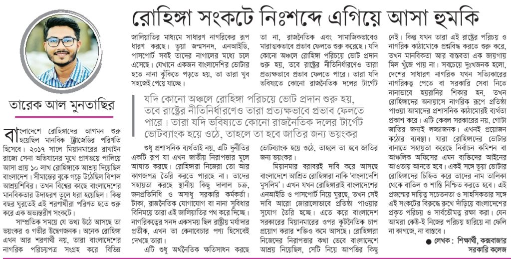 সাম্প্রতিক সময়ে যে তথ্য উঠে আসছে তা ভয়ঙ্কর ও গভীর উদ্বেগজনক। অনেক রোহিঙ্গা এখন আর শরণার্থী নয় তারা বাংলাদেশের নাগরিক পরিচয়পত্র সংগ্রহ করে বিভিন্ন জালিয়াতির মাধ্যমে সাধারণ নাগরিকের রূপ ধারণ করছে। ভুয়া জন্মসনদ, এনআইডি, পাসপোর্ট সবই তাদের নাগালের মধ্যে চলে এসেছে। যেখানে একজন বাংলাদেশির ভোটার হতে নানা ঝুকিতে পড়তে হয় তা তারা খুব সহজেই পেয়ে যাচ্ছে। তারা কেবল কক্সবাজার বা সীমান্ত এলাকায় সীমাবদ্ধ নেই ছড়িয়ে পড়েছে চট্টগ্রাম মহানগরীর কালামিয়া বাজার, হালিশহর, পাহাড়তলী, সীতাকুণ্ড, এমনকি রাজধানী ঢাকা ও দেশের অন্যান্য অঞ্চলেও।