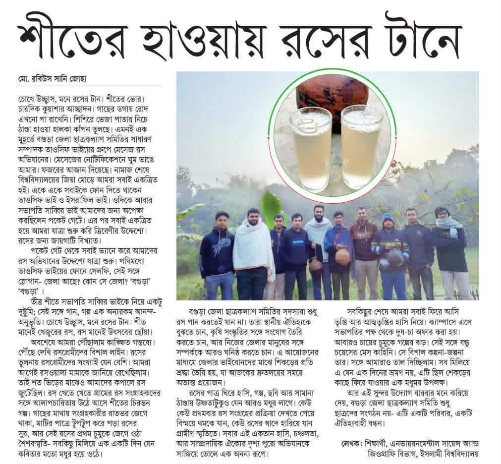 শীতের ভোর। চারদিকে কুয়াশার স্নিগ্ধ আচ্ছাদন। গাছের ডগায় রোদ এখনো পা রাখেনি; শিশিরে ভেজা পাতার নীচে ঠান্ডা হাওয়া হালকা কাঁপন তোলে। এমনই মুহূর্তে বগুড়া জেলা ছাত্রকল্যাণ সমিতির সাধারণ সম্পাদক তাওসিফ ভাইয়ের গ্রুপ এ মেসেজ- রস অভিযান এর। মেসেজ এর নোটিফিকেশন এ ঘুম ভাঙে আমার। ফজরের আযান দিয়েছে। নামাজ শেষে বিশ্ববিদ্যালয়ের জিয়া মোড়ে আমরা সকলে একত্রিত হই। একে একে সকলকে ফোন দিতে থাকে তাওসিফ ভাই ও ইসরাফিল ভাই। ও দিকে আবার সভাপতি সাব্বির ভাই আমাদের জন্য অপেক্ষা করছিল পকেট গেইটে। এরপর সকলে একত্রিত হয়ে আমরা যাত্রা শুরু করি ত্রিবেনীর উদ্দেশ্যে। রসের জন্য জায়গাটি বিখ্যাত।
