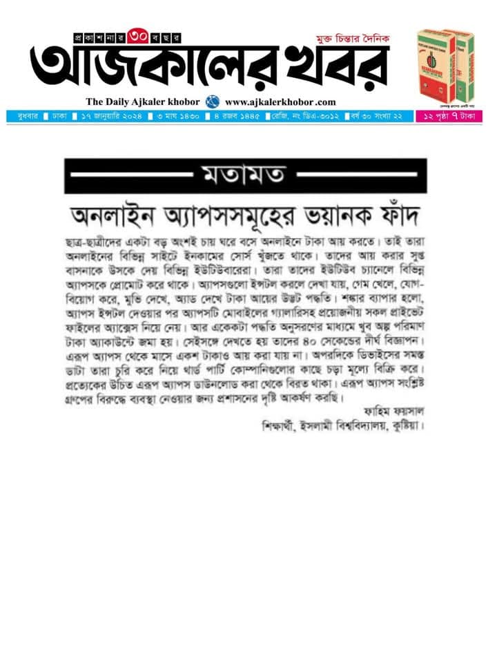 ছাত্র-ছাত্রীদের একটা বড় অংশই চায় ঘরে বসে অনলাইনে টাকা আয় করতে। তাই তারা অনলাইনের বিভিন্ন সাইটে ইনকামের সোর্স খুঁজতে থাকে। তাদের আয় করার সুপ্ত বাসনাকে উসকে দেয় বিভিন্ন ইউটিউবারেরা। তারা তাদের ইউটিউব চ্যানেলে বিভিন্ন অ্যাপসকে প্রোমোট করে থাকে। অ্যাপসগুলো ইন্সটল করলে দেখা যায়, গেম খেলে, যোগ-বিয়োগ করে, মুভি দেখে, অ্যাড দেখে টাকা আয়ের উদ্ভট পদ্ধতি। শঙ্কার ব্যাপার হলো, অ্যাপস ইন্সটল দেওয়ার পর অ্যাপসটি মোবাইলের গ্যালারিসহ প্রয়োজনীয় সকল প্রাইভেট ফাইলের অ্যাক্সেস নিয়ে নেয়। আর একেকটা পদ্ধতি অনুসরণের মাধ্যমে খুব অল্প পরিমাণ টাকা অ্যাকাউন্টে জমা হয়। সেইসঙ্গে দেখতে হয় তাদের ৪০ সেকেন্ডের দীর্ঘ বিজ্ঞাপন। এরূপ অ্যাপস থেকে মাসে একশ টাকাও আয় করা যায় না। অপরদিকে ডিভাইসের সমস্ত ভাটা তারা চুরি করে নিয়ে থার্ড পার্টি কোম্পানিগুলোর কাছে চড়া মূল্যে বিক্রি করে। প্রত্যেকের উচিত এরূপ অ্যাপস ডাউনলোড করা থেকে বিরত থাকা। এরূপ অ্যাপস সংশ্লিষ্ট গ্রুপের বিরুদ্ধে ব্যবস্থা নেওয়ার জন্য প্রশাসনের দৃষ্টি আকর্ষণ করছি।