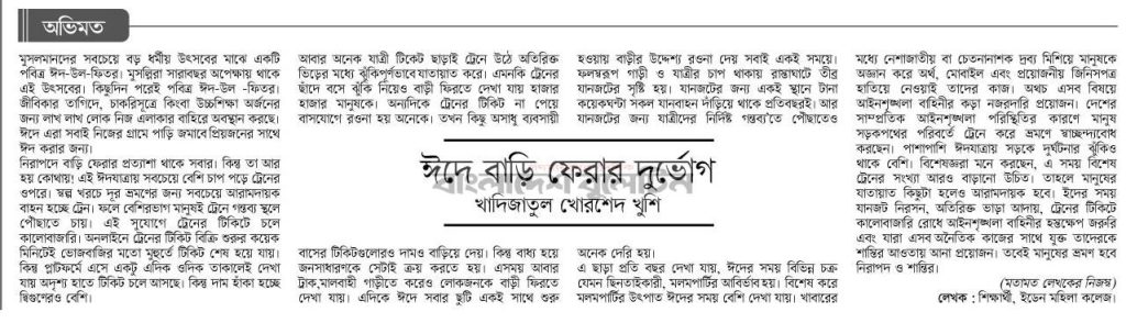 আবার অনেক যাত্রী টিকেট ছাড়াই ট্রেনে উঠে অতিরিক্ত ভিড়ের মধ্যে ঝুঁকিপূর্ণভাবে যাতায়াত করে। এমনকি ট্রেনের ছাঁদে বসে ঝুঁকি নিয়েও বাড়ী ফিরতে দেখা যায় হাজার হাজার মানুষকে। অন্যদিকে ট্রেনের টিকিট না পেয়ে বাসযোগে রওনা হয় অনেকে। তখন কিছু অসাধু ব্যবসায়ী বাসের টিকিটগুলোরও দামও বাড়িয়ে দেয়। কিন্তু বাধ্য হয়ে জনসাধারণকে সেটাই ক্রয় করতে হয়। এসময় আবার ট্রাক,মালবাহী গাড়ীতে করেও লোকজনকে বাড়ী ফিরতে দেখা যায়। এদিকে ঈদে সবার ছুটি একই সাথে শুরু হওয়ায় বাড়ীর উদ্দেশ্য রওনা দেয় সবাই একই সময়ে। ফলস্বরূপ গাড়ী ও যাত্রীর চাপ থাকায় রাস্তাঘাটে তীব্র যানজটের সৃষ্টি হয়। যানজটের জন্য একই স্থানে টানা কয়েকঘন্টা সকল যানবাহন দাঁড়িয়ে থাকে প্রতিবছরই। আর যানজটের জন্য যাত্রীদের নির্দিষ্ট গন্তব্য’তে পৌঁছাতেও অনেক দেরি হয়।এছাড়া প্রতি বছর দেখা যায়, ঈদের সময় বিভিন্ন চক্র যেমন ছিনতাইকারী, মলমপার্টির আবির্ভাব হয়। বিশেষ করে মলমপার্টির উৎপাত ঈদের সময় বেশি দেখা যায়। খাবারের মধ্যে নেশাজাতীয় বা চেতনানাশক দ্রব্য মিশিয়ে মানুষকে অজ্ঞান করে অর্থ, মোবাইল এবং প্রয়োজনীয় জিনিসপত্র হাতিয়ে নেওয়াই তাদের কাজ। অথচ এসব বিষয়ে আইনশৃঙ্খলা বাহিনীর কড়া নজরদারি প্রয়োজন। দেশের সাম্প্রতিক আইনশৃঙ্খলা পরিস্থিতির কারণে মানুষ সড়কপথের পরিবর্তে ট্রেনে করে ভ্রমণে স্বাচ্ছন্দ্যবোধ করছেন। পাশাপাশি ঈদযাত্রায় সড়কে দুর্ঘটনার ঝুঁকিও থাকে বেশি। বিশেষজ্ঞরা মনে করছেন, এ সময় বিশেষ ট্রেনের সংখ্যা আরও বাড়ানো উচিত। তাহলে মানুষের যাতায়াত কিছুটা হলেও আরামদায়ক হবে। ইদের সময় যানজট নিরসন, অতিরিক্ত ভাড়া আদায়, ট্রেনের টিকিটে কালোবাজারি রোধে আইনশৃঙ্খলা বাহিনীর হস্তক্ষেপ জরুরি এবং যারা এসব অনৈতিক কাজের সাথে যুক্ত তাদেরকে শাস্তির আওতায় আনা প্রয়োজন। তবেই মানুষের ভ্রমণ হবে নিরাপদ ও শান্তির।