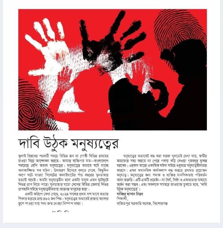 জুলাই বিপ্লবের পরবর্তী সময়ে বিভিন্ন জন বা গোষ্ঠী বিভিন্ন রকমের চাওয়া নিয়ে আন্দোলন করছে। আমার ব্যক্তিগত মত—বাংলাদেশে সবচেয়ে বেশি অভাব মনুষ্যত্বের। মনুষ্যত্বের অভাবে ঘটে যাচ্ছে অনাকাঙ্ক্ষিত সব ঘটনা। উদাহরণ হিসেবে বলতে গেলে, কিছুদিন আগে ঘটে যাওয়া সিলেটের কানাইঘাটের পাঁচ বছরের মুনতাহার হত্যাই যথেষ্ট। কতটা মনুষ্যত্বহীন হলে একটা মানুষ এমন ফুটফুটে শিশুর প্রাণ নিতে পারে। মুনতাহার মতো দেশের বিভিন্ন জেলায় শিশুর প্রাণহানি ঘটছে মনুষ্যত্বহীনতায় আক্রান্ত মানুষের দ্বারা।