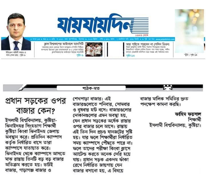 ইসলামী বিশ্ববিদ্যালয়, কুষ্টিয়া-ঝিনাইদহর সিংহভাগ শিক্ষার্থী কুষ্টিয়া কিংবা ঝিনাইদহ জেলায় অবস্থান করে। প্রতিদিন ক্যাম্পাস কর্তৃক নির্ধারিত বাসে তারা ক্যাম্পাসে যাতায়াত করে। ঝিনাইদহ থেকে ক্যাম্পাসে আসতে মাঝ রাস্তায় তিনটি বড় বড় বাজার অতিক্রম করতে হয়। ভাটই বাজার, গাড়াগঞ্জ বাজার ও শেখপাড়া বাজার। এই বাজারগুলোতে শনিবার, সোমবার ও বুধবার হাট বসে। বাজারগুলোর দোকানগুলোর এমন অবস্থা হয়, যেন প্রধান সড়কের অর্ধেক রাস্তার ওপর বাজার চলে আসে। রাস্তায় এই তিন দিন প্রচণ্ড যানজটের সৃষ্টি হয়। যার ফলে শিক্ষার্থীরা নির্ধারিত সময় ক্যাম্পাসে পৌছতে পারে না। ফলে তাদের পরীক্ষা কিংবা ক্লাসে অ্যাটেন্ড করতে অনেক দেরি হয়ে যায়। প্রধান সড়ক একদম ফাঁকা রেখে নির্ধারিত জায়গায় যেন বাজার বসানো হয়, এ বিষয়ে বাজার মালিক সমিতির দ্রুত পদক্ষেপ কামনা করছি।