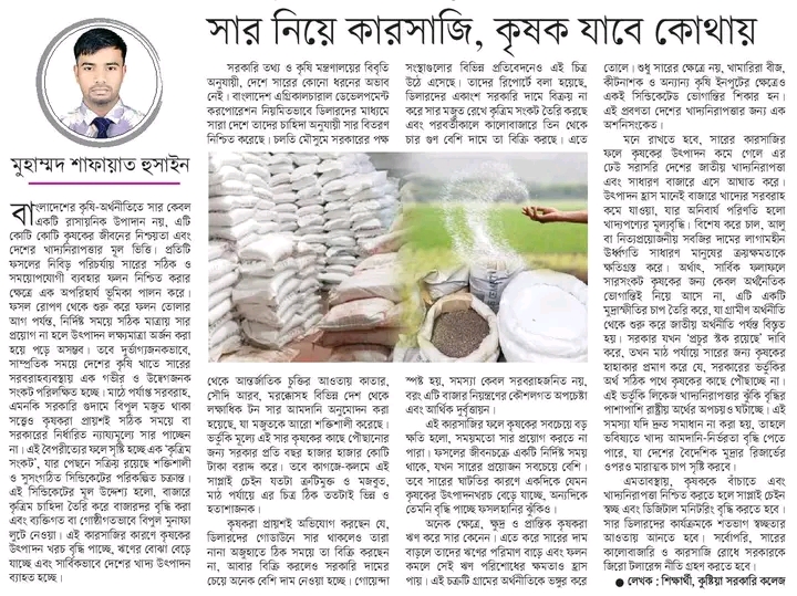 তোলে। শুধু সারের ক্ষেত্রে নয়, খামারিরা বীজ, কীটনাশক ও অন্যান্য কৃষি ইনপুটের ক্ষেত্রেও একই সিন্ডিকেটেড ভোগান্তির শিকার হন। এই প্রবণতা দেশের খাদ্যনিরাপত্তার জন্য এক অশনিসংকেত।