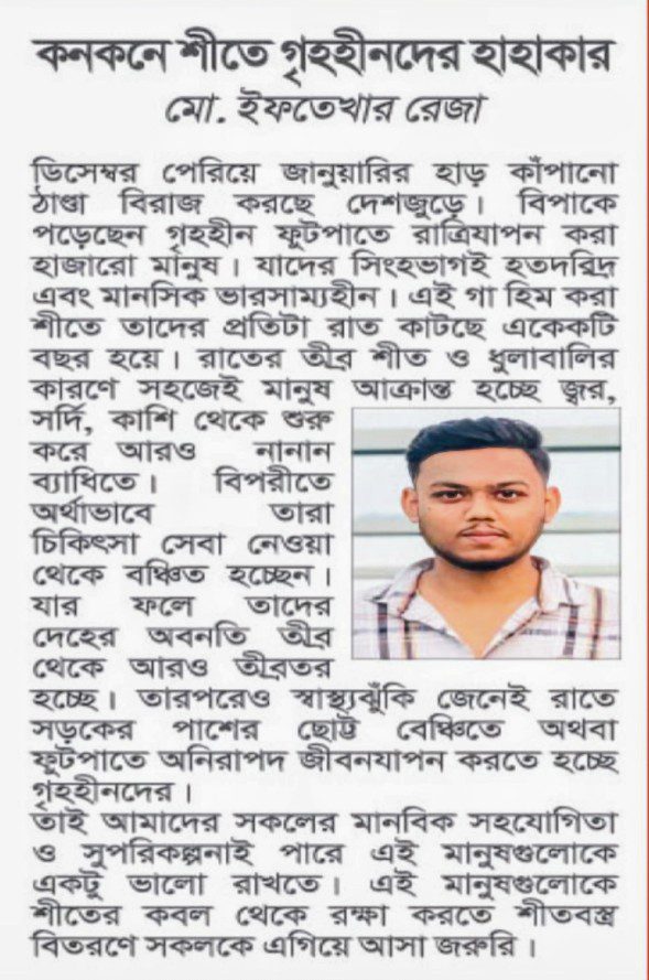 ডিসেম্বর পেরিয়ে জানুয়ারির হাড় কাঁপানো ঠান্ডা বিরাজ করছে দেশজুড়ে। বিপাকে পড়েছেন গৃহহীন ফুটপাতে রাত্রিযাপন করা হাজারো মানুষ। যাদের সিংহভাগই হতদরিদ্র এবং মানসিক ভারসাম্যহীন। এই গা হিম করা শীতে তাদের প্রতিটা রাত কাটছে একেকটি বছর হয়ে। রাতের তীব্র শীত ও ধুলাবালির কারণে সহজেই মানুষ আক্রান্ত হচ্ছে জ্বর, সর্দি, কাশি থেকে শুরু করে আরও নানান ব্যাধীতে। বিপরীতে অর্থাভাবে তারা চিকিৎসা সেবা নেওয়া থেকে বঞ্চিত হচ্ছেন। যার ফলে তাদের দেহের অবনতি তীব্র থেকে আরও তীব্রতর হচ্ছে। তারপরেও স্বাস্থ্যঝুঁকি জেনেই রাতে সড়কের পাশের ছোট্ট বেঞ্চিতে অথবা ফুটপাতে অনিরাপদ জীবনযাপন করতে হচ্ছে গৃহহীনদের।