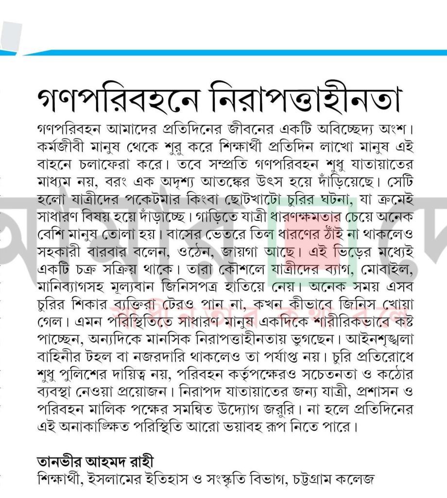 গণপরিবহন আমাদের প্রতিদিনের জীবনের একটি অবিচ্ছেদ্য অংশ। কর্মজীবী মানুষ থেকে শুরু করে শিক্ষার্থী প্রতিদিন লাখো মানুষ এই বাহনে চলাফেরা করেন। তবে সম্প্রতি গণপরিবহন শুধু যাতায়াতের মাধ্যম নয়, বরং এক অদৃশ্য আতঙ্কের উৎস হয়ে দাঁড়িয়েছে। সেটি হলো যাত্রীদের পকেটমার কিংবা ছোটখাটো চুরির ঘটনা, যা ক্রমেই সাধারণ বিষয় হয়ে দাঁড়াচ্ছে। গাড়িতে যাত্রী ধারণক্ষমতার চেয়ে অনেক বেশি মানুষ তোলা হয়। বাসের ভিতরে তিল ধারণের ঠাঁই না থাকলেও সহকারী বারবার বলেন, ওঠেন, জায়গা আছে। এই ভিড়ের মধ্যেই একটি চক্র সক্রিয় থাকে। তারা কৌশলে যাত্রীদের ব্যাগ, মোবাইল, মানিব্যাগসহ মূল্যবান জিনিসপত্র হাতিয়ে নেয়। অনেক সময় এসব চুরির শিকার ব্যক্তিরা টেরও পান না, কখন কীভাবে জিনিস খোয়া গেল। এমন পরিস্থিতিতে সাধারণ মানুষ একদিকে শারীরিকভাবে কষ্ট পাচ্ছেন, অন্যদিকে মানসিক নিরাপত্তাহীনতায় ভুগছেন। আইনশৃঙ্খলা বাহিনীর টহল বা নজরদারি থাকলেও তা পর্যাপ্ত নয়। চুরি প্রতিরোধে শুধু পুলিশের দায়িত্ব নয়, পরিবহন কর্তৃপক্ষেরও সচেতনতা ও কঠোর ব্যবস্থা নেওয়া প্রয়োজন। নিরাপদ যাতায়াতের জন্য যাত্রী, প্রশাসন ও পরিবহন মালিকপক্ষের সমন্বিত উদ্যোগ জরুরি। নাহলে প্রতিদিনের এ অনাকাঙ্ক্ষিত পরিস্থিতি আরও ভয়াবহ রূপ নিতে পারে।