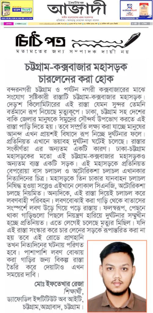 বন্দরনগরী চট্টগ্রাম ও পর্যটন নগরী কক্সবাজারের মাঝে সংযোগ সৃষ্টিকারী রাস্তাটি চট্টগ্রাম-কক্সবাজার মহাসড়ক। দেড়শ কিলোমিটার এই রাস্তা যেমন সুন্দর তেমনি বর্তমানে রূপ নিয়েছে মৃত্যুকূপে। ঢাকা, চট্টগ্রাম সহ দেশের বাকি জেলার মানুষকে সমুদ্রের সৌন্দর্য উপভোগ করতে এই রাস্তা পাড়ি দিতে হয়। তবে সম্প্রতি লক্ষ করা যাচ্ছে মানুষের আনন্দ এখন প্রায়সই বিষাদে রূপ নিচ্ছে দূর্ঘটনার ফলে। প্রতিনিয়ত এখানে ভয়াবহ দূর্ঘটনা ঘটেই চলেছে। রাস্তার সংকীর্ণতা এর অন্যতম একটি কারণ। ঢাকা-চট্টগ্রাম মহাসড়কের মতো এই চট্টগ্রাম-কক্সবাজার মহাসড়কও অন্যতম ব্যস্ত একটি সড়ক। কিন্ত ঢাকা-চট্টগ্রাম মহাসড়ক ৪ লেনের হওয়াতে খুব বেশি দূর্ঘটনা বা জ্যাম দেখা যায় না। কিন্ত চট্টগ্রাম-কক্সবাজার মহাসড়ক তার সম্পূর্ণ বিপরীত। এই মহাসড়কে প্রতিনিয়ত বেপরোয়া বাস চলাচল ও অটোরিকশা চলাচল এখানকার নিত্যদিনের চিত্র। মহাসড়কে তিন চাকার যানবাহন চলাচল নিষিদ্ধ হওয়া সত্বেও এইখানে লোকাল সিএনজি, অটোরিকশা চলছে নিয়মিত। অন্যদিকে এই রোড দিয়েই চলাচল করে লবনবাহী যানবাহন। লবনবোঝাই করা গাড়ি থেকে বাতাসের সংস্পর্শে লবণ উড়ে গিয়ে পড়ে রাস্তায়। ফলাফলস্বরূপ পেছনে থাকা গাড়িগুলো চালা স্লিপ করে নিয়ন্ত্রণ হারিয়ে দূর্ঘটনার সম্মুখীন হচ্ছে প্রতিনিয়ত। এতে লেগেই চলেছে মৃত্যুর মিছিল। যদি এই রাস্তা সংস্কার করে চার লেনের সড়কে রূপান্তরিত করা না হয় তবে এই রোডে প্রাণহানি তখন নিত্যদিনের ঘটনায় পরিণত হবে। পাশাপাশি লবণ বোঝায় করা গাড়ির জন্য বিকল্প রাস্তা তৈরি করে দেয়াটাও এখন সময়ের দাবি।