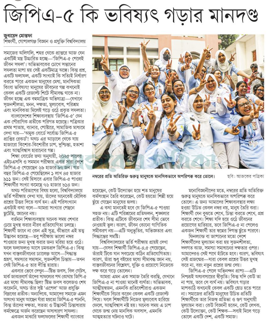 হোম / কলাম/মতামত / নিবন্ধজিপিএ-৫ কি ভবিষ্যৎ গড়ার মানদণ্ড জুবায়েদ মোস্তফা , গোপালগঞ্জ বিজ্ঞান ও প্রযুক্তি বিশ্ববিদ্যালয় প্রকাশ: ১৮ অক্টোবর ২০২৫ পাঠ: ৩৭ বার জিপিএ-৫ কি ভবিষ্যৎ গড়ার মানদণ্ডলেখক: সম্পাদকীয় পর্ষদ, কেন্দ্রীয় কার্যনির্বাহী পর্ষদ।এই লেখাটি ১৮ অক্টোবর ২০২৫ তারিখে আজকের পত্রিকা পত্রিকায় প্রকাশিত। লেখাটি শেয়ার করুন: