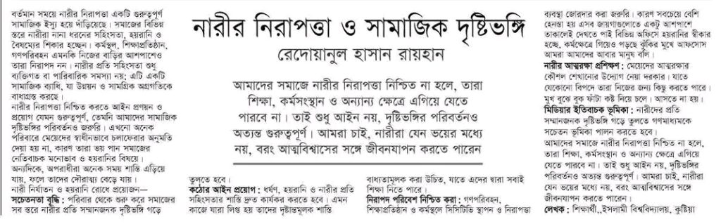 হোম / কলাম/মতামত / নিবন্ধনারী নিরাপত্তা ও সামাজিক দৃষ্টিভঙ্গি এস এম রেদোয়ানুল হাসান , ইসলামী বিশ্ববিদ্যালয় প্রকাশ: ৩ মার্চ ২০২৫ পাঠ: ৪৭ বার লেখক: প্রশিক্ষণ বিষয়ক সম্পাদক, ইসলামী বিশ্ববিদ্যালয় শাখা।এই লেখাটি ৩ মার্চ ২০২৫ তারিখে দৈনিক জবাবদিহি পত্রিকায় প্রকাশিত। লেখাটি শেয়ার করুন: