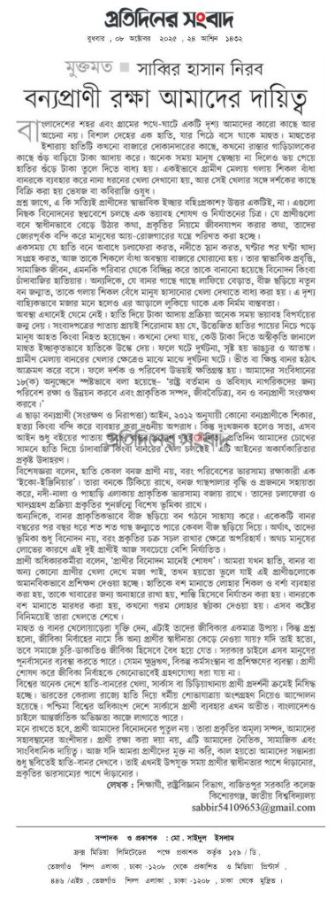 মনে রাখতে হবে, প্রাণী আমাদের বিনোদনের পুতুল নয়। তারা প্রকৃতির অমূল্য সম্পদ, আমাদের সহাবস্থানের অংশীদার। প্রাণী রক্ষা করা দয়া নয়, এটি আমাদের নৈতিক, সামাজিক এবং সাংবিধানিক দায়িত্ব। আজ যদি আমরা প্রাণীদের মুক্ত না করি, কাল হয়তো আমাদের সন্তানরা শুধু ছবিতেই হাতি-বানর দেখবে। তাই এখনই উপযুক্ত সময় প্রাণীর স্বাধীনতার পাশে দাঁড়ানোর, প্রকৃতির ভারসাম্যের পাশে দাঁড়ানোর।