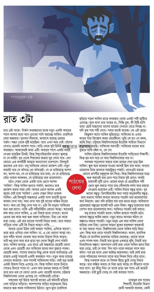 আবার ডেকে উঠল সেই অবয়ব ‘সাকিব, এদিকে আসো’। ভয়ে ভয়ে এগিয়ে গেল সাকিব। না, এ তো কোনো আত্মা নয়। তার শরীর কালো বোরকা আর কালো হিজাব দিয়ে আবৃত। তাই শুধু মাথা আর হাত ছাড়া দূর থেকে কিছুই দেখা যায়নি তার। সাকিব ভাবছে- এত রাতে এই অন্ধকারে মেয়েটি কোথা থেকে এল? মেয়েটি যেন সাকিবের মনের কথা বুঝতে পারল। মেয়েটি বলল, পাশের বাজারে কিছু লোক তাকে জানিয়েছে এই রাস্তায় একটু সামনেই একটা কবরস্থান পাব। নতুন কবর হয়েছে সেখানে আজকে। তার পাশেই সাকিবদের বাড়ি। সেই সূত্র ধরেই একটা রিকশা নিয়ে এসেছে সে। কিন্তু সাকিব তাকে চিনতে পেরেও চিনতে পারে না। এখন আর ভয়ডর করছে না ঠিকই তবে মনে প্রশ্ন সে কোথা থেকে এল? মেয়েটি জানাল, চট্টগ্রাম বিশ্ববিদ্যালয় থেকে এসেছে সে। সাকিবেরই খোঁজে।