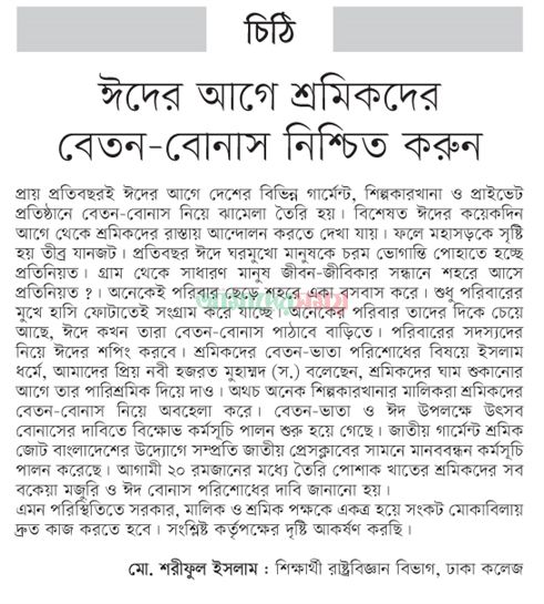 ধর্মপ্রাণ মুসলমানদের প্রতিবছর দুইটি ঈদ আসে। প্রায় সময় প্রতি বছরে ঈদের আগে দেশের বিভিন্ন গার্মেন্টস, শিল্প কারখানা ও প্রাইভেট প্রতিষ্ঠানে বেতন-বোনাস নিয়ে ঝামেলা তৈরি হয়। বিশেষত ঈদের কয়েক দিন আগে থেকে অনেক শ্রমিকদের কে রাস্তায় আন্দোলন করতে দেখা যায়। ফলাফল স্বরূপ মহাসড়কে সৃষ্টি হয় তীব্র যানজট। প্রতি বছর ঈদে ঘরমুখো মানুষকে চরম ভোগান্তি পোহাতে হচ্ছে প্রতিনিয়ত। গ্রাম থেকে সাধারণ মানুষ জীবন জীবিকার সন্ধানে শহরে আসে প্রতিনিয়ত ‌। অনেকেই পরিবার ছেড়ে শহরে একা বসবাস করে। শুধুমাত্র পরিবারের মুখে হাসি ফোটাতে সংগ্রাম করে যাচ্ছে প্রতিনিয়ত। অনেকের পরিবার তাদের দিকে চেয়ে আছে, ঈদে কখন তারা বেতন-বোনাস পাঠাবে বাড়িতে। পরিবারের সদস্যদের নিয়ে ঈদের শপিং করবে । শ্রমিকদের বেতন-ভাতা পরিশোধের বিষয়ে ইসলাম ধর্মে, আমাদের প্রিয় নবী হযরত মুহাম্মদ (স.) বলেছেন, শ্রমিকদের ঘাম শুকানোর পূর্বে তার পারিশ্রমিক দিয়ে দাও। অথচ অনেক শিল্প কারখানার মালিকরা শ্রমিকদের বেতন-বোনাস নিয়ে অবহেলা করে। এ বছরও ব্যতিক্রম নয়, তেমনই আলামত দেখা যাচ্ছে। সম্প্রতি গণমাধ্যমে প্রকাশিত প্রতিবেদন থেকে জানা যায়, ৬০ থেকে ৭০টি কারখানায় বেতন-বোনাস নিয়ে অসন্তোষ তৈরি হতে পারে বলে আশঙ্কা করছেন, মালিক ও শ্রমিক সংগঠনের নেতাকর্মীরা। এরই ধারাবাহিকতায় পুরো শিল্পাঞ্চলেই অস্থিরতার সৃষ্টি হতে পারে, যা নতুন সরকার চ্যালেঞ্জের সম্মুখীন । বেতন-ভাতা ও ঈদ উপলক্ষে উৎসব বোনাসের দাবিতে বিক্ষোভ কর্মসূচি পালন শুরু হয়ে গেছে। জাতীয় গার্মেন্টস প্রমিক জোট বাংলাদেশের উদ্যোগে সম্প্রতি জাতীয় প্রেস ক্লাবের সামনে মানববন্ধন কর্মসূচি পালন করেছে। আগামী ২০ রমজানের মধ্যে তৈরি পোশাক খাতের শ্রমিকদের সব বকেয়া মজুরি ও ঈদ বোনাস পরিশোধের দাবি জানানো হয়। সম্প্রতি গাজীপুর মহানগরীর কোনাবাড়ী এলাকায় অবস্থিত রিপন নিটওয়্যারের শ্রমিকরা নাইট বিল ও বার্ষিক ছুটির পাওনা পরিশোধের দাবিতে কর্মবিরতি ও বিক্ষোত কর্মসূচি পালন করেছেন। এদিকে ঈদুল ফিতরের আগে শ্রমিকদের বেতন ও বোনাল পরিশোধে সম্ভাব্য আর্থিক চাপ মোকাবেলায় স্বল্প সুদে ঋণ (সফট লেন) ও বকেয়া নগদ প্রণোদনার অর্থ দ্রুত ছাড়ের দাবি জানিয়েছে বাংলাদেশ তৈরি পোশাক প্রস্তুত ও রপ্তানিকারক সমিতি (বিজিএমইএ)। এমন পরিস্থিতিতে সরকার, মালিক ও শ্রমিক পক্ষকে একত্র হয়ে সংকট মোকাবেলায় দ্রুত কাজ করতে হবে। সংশ্লিষ্ট কর্তৃপক্ষের দৃষ্টি আকর্ষণ করছি। মোঃ শরীফুল ইসলাম, শিক্ষার্থী রাষ্ট্রবিজ্ঞান বিভাগ, ঢাকা কলেজ।”>http://ধর্মপ্রাণ মুসলমানদের প্রতিবছর দুইটি ঈদ আসে। প্রায় সময় প্রতি বছরে ঈদের আগে দেশের বিভিন্ন গার্মেন্টস, শিল্প কারখানা ও প্রাইভেট প্রতিষ্ঠানে বেতন-বোনাস 