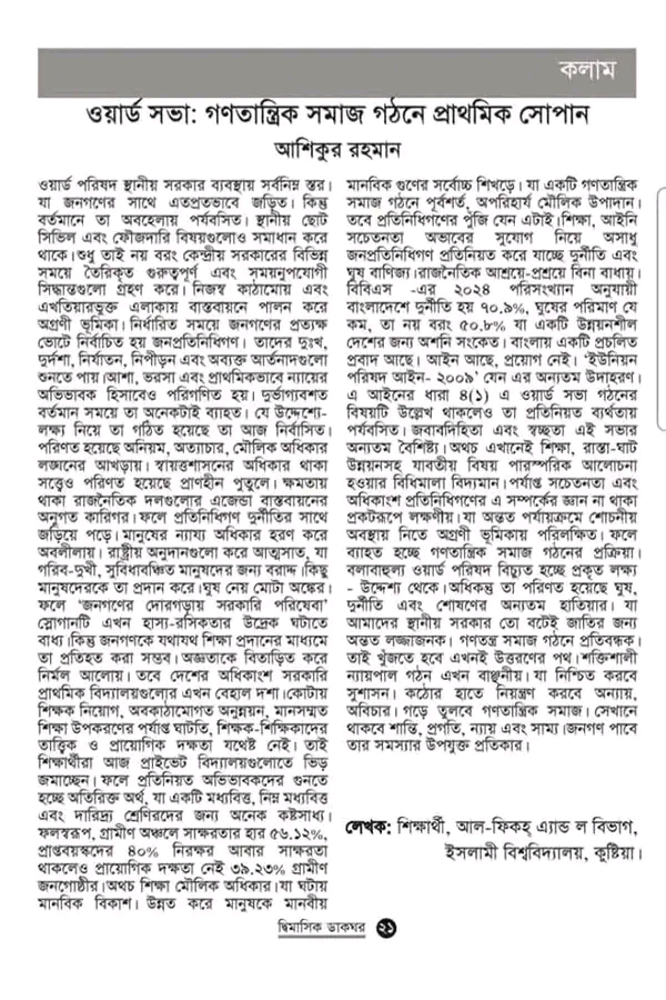 হোম / কলাম/মতামত / নিবন্ধওয়ার্ড সভা: গণতান্ত্রিক সমাজ গঠনে প্রাথমিক সোপান আশিকুর রহমান , ইসলামী বিশ্ববিদ্যালয়, কুষ্টিয়া। প্রকাশ: ২০ জানুয়ারি ২০২৬ পাঠ: ৩৮ বার লেখক: সদস্য, ইসলামী বিশ্ববিদ্যালয়।এই লেখাটি ২০ জানুয়ারি ২০২৬ তারিখে ডাকঘর পত্রিকায় প্রকাশিত। লেখাটি শেয়ার করুন: