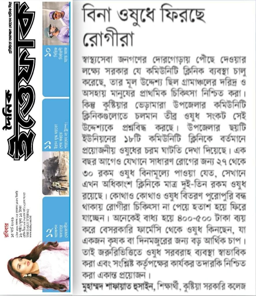 স্বাস্থ্যসেবা জনগণের দোরগোড়ায় পৌঁছে দেওয়ার লক্ষ্যে সরকার যে কমিউনিটি ক্লিনিক ব্যবস্থা চালু করেছে, তার মূল উদ্দেশ্য ছিল গ্রামাঞ্চলের দরিদ্র ও অসহায় মানুষের প্রাথমিক চিকিৎসা নিশ্চিত করা। কিন্তু কুষ্টিয়ার ভেড়ামারা উপজেলার কমিউনিটি ক্লিনিকগুলোতে চলমান তীব্র ওষুধ সংকট সেই উদ্দেশ্যকে প্রশ্নবিদ্ধ করছে। উপজেলার ছয়টি ইউনিয়নের ১৮টি কমিউনিটি ক্লিনিকে বর্তমানে প্রয়োজনীয় ওষুধের চরম ঘাটতি দেখা দিয়েছে। এক বছর আগেও যেখানে সাধারণ রোগের জন্য ২৭ থেকে ৩০ রকম ওষুধ বিনামূল্যে পাওয়া যেত, সেখানে এখন অধিকাংশ ক্লিনিকে মাত্র দুই-তিন রকম ওষুধ রয়েছে। কোথাও কোথাও ওষুধ বিতরণ পুরোপুরি বন্ধ থাকায় রোগীরা চিকিৎসা না পেয়ে হতাশ হয়ে ফিরে যাচ্ছেন। অনেকেই বাধ্য হয়ে ৪০০-৫০০ টাকা ব্যয় করে বেসরকারি ফার্মেসি থেকে ওষুধ কিনছেন, যা একজন কৃষক বা দিনমজুরের জন্য বড় আর্থিক চাপ। তাই জরুরিভিত্তিতে ওষুধ সরবরাহ ব্যবস্থা স্বাভাবিক করা এবং সংশ্লিষ্ট কর্তৃপক্ষের কার্যকর তদারকি নিশ্চিত করা একান্ত প্রয়োজন।