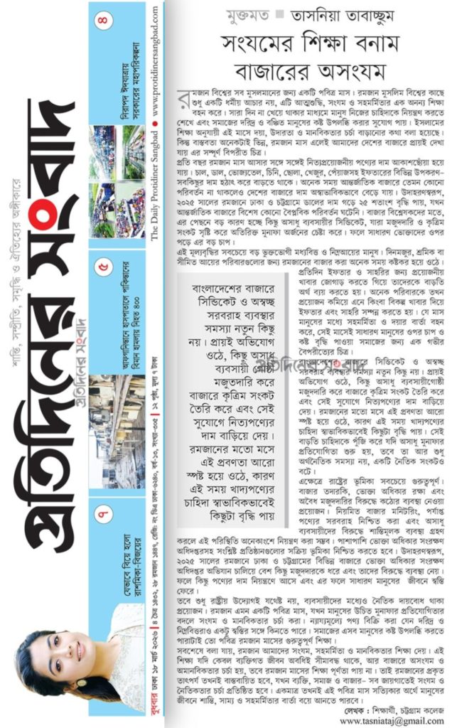 রমজান বিশ্বের সকল মুসলমানের জন্য একটি পবিত্র মাস। রমজান মুসলিম বিশ্বের কাছে শুধু একটি ধর্মীয় আচার নয়, এটি আত্মশুদ্ধি, সংযম ও সহমর্মিতার এক অনন্য শিক্ষা বহন করে। সারাদিন না খেয়ে থাকার মাধ্যমে মানুষ নিজের চাহিদাকে নিয়ন্ত্রণ করতে শেখে এবং সমাজের দরিদ্র ও বঞ্চিত মানুষের কষ্ট উপলব্ধি করার সুযোগ পায়। ইসলামের শিক্ষা অনুযায়ী এই মাসে দয়া, উদারতা ও মানবিকতার চর্চা বাড়ানোর কথা বলা হয়েছে। কিন্তু বাস্তবতা অনেকটাই ভিন্ন, রমজান মাস এলেই আমাদের দেশের বাজারে প্রায়ই দেখা যায় এর সম্পূর্ণ বিপরীত চিত্র।