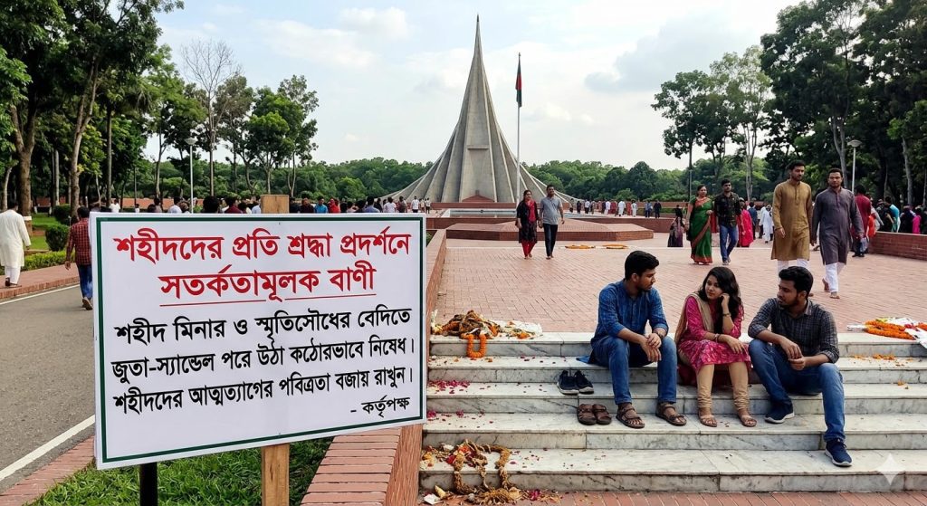 ভাষা আন্দোলন, মুক্তিযুদ্ধসহ দেশমাতৃকার বিভিন্ন নায্য দাবী আদায়ে অকাতরে জীবন বিলিয়ে দেওয়া শহীদদের স্মরণে দেশের নানা স্থানে নির্মিত হয়েছে শহীদ মিনার, স্মৃতিসৌধসহ বিভিন্ন স্মৃতিমূলক স্তম্ভ। বিশেষ দিবস সমূহে এইসব স্থাপনায় কেউ যেন জুতা-সেন্ডেল পরে উঠতে না পারে সে জন্য কর্তৃপক্ষকে কঠোর ব্যবস্থা নিতে দেখা যায়। অথচ দিবস শেষ হলেই আবার জুতা-সেন্ডেল পরে বিচরণ বা আড্ডা দিতে দেখা যায় সর্বসাধারণকে। দেশের অনেক স্মৃতিসৌধ এবং শহীদ মিনারে ‘জুতা-সেন্ডেল পরে উঠা নিষেধ’ এইরকম সতর্কতামূলক বানী দিয়ে সাইনবোর্ডও লেখা নেই যাতে সাধারণ জনগণ সচেতন হতে পারে। শহীদদের আত্মত্যাগের স্মরণে নির্মিত এই স্থাপনাসমূহের পবিত্রতা বজায় রাখতে কর্তৃপক্ষকে যথাযথ ব্যবস্থা করতে অনুরোধ করছি।