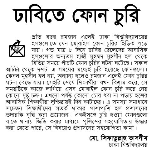 প্রতি বছর রমজান এলেই ঢাকা বিশ্ববিদ্যালয়ের হলগুলোতে যেন মোবাইল ফোন চুরির হিড়িক পড়ে যায়। গত মাত্র ৮ দিনে ঢাবির ছেলেদের আবাসিক হলগুলোর অন্যতম হাজী মুহম্মদ মুহসীন হল থেকে বিভিন্ন সময়ে পাঁচটি ফোন চুরির ঘটনা ঘটেছে। সকাল আটটা থেকে দশটা এ সময়ের মধ্যেই চুরি হয়েছে ফোনগুলো। কেবল মুহসীন হল নয়, অন্যান্য হলেও রমজান এলেই ফোন চুরির ঘটনা বেড়ে যায়। সেহরি শেষে শিক্ষার্থীরা যখন বিশ্রাম করে, সে সময়টিকে কাজে লাগিয়ে এসব মোবাইল ফোন চুরি করে নেয় কোনো দুষ্টু চক্র। এখনো পর্যন্ত কোনো চোর ধরা না পড়ায় হলের আবাসিক শিক্ষার্থীরা দুশ্চিন্তায় দিন কাটাচ্ছে। এ সমস্যা সমাধানে সচেতন শিক্ষার্থীদের সতর্ক থাকার পাশাপাশি হল প্রশাসনের তদারকি বৃদ্ধি করা প্রয়োজন। একইসঙ্গে চুরি হওয়া ফোনগুলো যাতে থানায় জিডি করার মাধ্যমে পুলিশের সহযোগিতায় উদ্ধার করা যেতে পারে, সে বিষয়েও প্রশাসনের সহযোগিতা কাম্য।