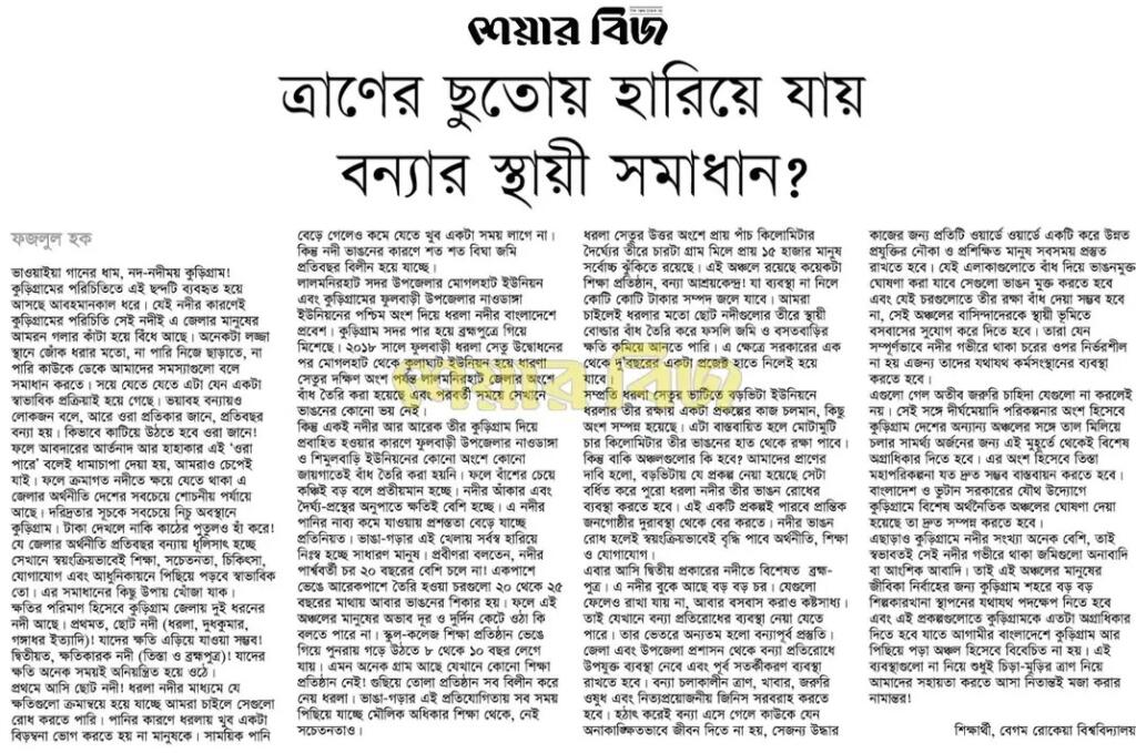 কুড়িগ্রাম জেলার নদী ভাঙ্গন বন্যার সমস্যা ও সংশ্লিষ্ট ভোগান্তি নিয়ে লিখিত এই কলাম। যেখানে বন্যার স্থায়ী সমাধানের পরিবর্তে শুধুমাত্র ত্রাণ দিয়েই দায়িত্ব সমাপ্ত করা হয়। লেখা হয়েছে এই বিষয় নিয়েই যে কেন সেখানে ত্রাণ স্থায়ী সমাধানকে কেড়ে নেয়?