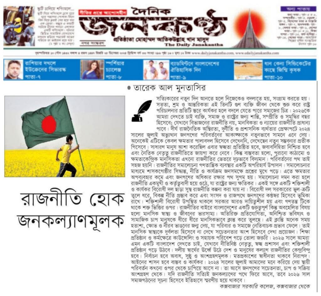 সত্যিকারের নতুন দিন আনতে হলে নিজেকেও বদলাতে হয়, সংগ্রাম করতে হয়। সততা, শ্রম ও আন্তরিকতা এই তিনটি গুণ ব্যক্তি জীবন থেকে শুরু করে রাষ্ট্র পরিচালনার প্রতিটি স্তরে কার্যকর হলে বদলে যেতে পারে সমাজের চিত্র। ২০২৬কে আমরা দেখতে চাই ব্যক্তি, সমাজ ও রাষ্ট্রের জন্য শান্তি, সম্প্রীতি ও সমৃদ্ধির বছর হিসেবে; যেখানে বিভাজনের রাজনীতি নয়, মানবিকতা ও ন্যায়ের রাজনীতি প্রাধান্য পাবে। দীর্ঘ রাজনৈতিক অস্থিরতা, দুর্নীতি ও প্রশাসনিক ব্যর্থতার প্রেক্ষাপটে ২০২৪ সালের জুলাই অভ্যুত্থান জনগণের পরিবর্তনের আকাঙ্ক্ষাকে নতুনভাবে সামনে এনে দেয়। অনেকেই এটিকে কেবল ক্ষমতার পালাবদল হিসেবে দেখেননি, দেখেছেন নতুন সম্ভবনার প্রতীক গিসেবে। সাধারণ মানুষ আশা করেছিল এবার স্বচ্ছতা প্রতিষ্ঠিত হবে, জবাবদিহিতা নিশ্চিত হবে এবং নৈতিক নেতৃত্ব রাজনীতিতে জায়গা করে নেবে। কিন্তু বাস্তবতা হলো, পুরানো কাঠামো ও ক্ষমতাকেন্দ্রিক মানসিকতা এখনো রাজনীতির ভেতরে দৃঢ়ভাবে বিদ্যমান। পরিবর্তনের পথ তাই সহজ হয়নি। রাজনীতির সমালোচনা গণতান্ত্রিক ব্যবস্থার একটি অপরিহার্য উপাদান। সমালোচনার মাধ্যমে শাসকগোষ্ঠীর সিদ্ধান্ত, নীতি ও কার্যক্রম জনসমক্ষে প্রশ্নের মুখে পড়ে। এতে ক্ষমতার অপব্যবহার কমে এবং জনগণের অধিকার রক্ষার পথ সুগম হয়। সমালোচনা দমন করা হলে রাজনীতি একমুখী ও কর্তৃত্ববাদী হয়ে ওঠে, যা রাষ্ট্রের জন্য ক্ষতিকর। একই সঙ্গে একটি শক্তিশালী ও কার্যকর বিরোধী দল ছাড়া সুস্থ রাজনীতি কল্পনা করা যায় না। বিরোধী দল সরকারের ভুল-ত্রুটি তুলে ধরে, বিকল্প নীতি প্রস্তাব করে এবং সংসদ ও রাজপথে জনগণের কণ্ঠস্বর হিসেবে ভূমিকা রাখে। শক্তিশালী বিরোধী উপস্থিত থাকলে সরকার আরও দায়িত্বশীল হয় এবং গণতন্ত্র টিকে থাকে শক্ত ভিত্তির ওপর। রাজনীতির বাইরে বাংলাদেশের একটি গুরুত্বপূর্ণ কিন্তু অবহেলিত বিষয় হলো মানসিক স্বাস্থ্য ও জীবনের ভারসাম্য। অতিরিক্ত প্রতিযোগিতা, অনিশ্চিত ভবিষ্যৎ ও সামাজিক চাপ মানুষকে ধীরে ধীরে মানসিকভাবে ক্লান্ত করে তুলছে। এই ক্লান্তি অনেক সময় হতাশা, ক্ষোভ ও নীরব ভাঙনের জন্ম দেয়, যা পরিবার ও সমাজে নেতিবাচক প্রভাব ফেলে। তাই মানসিক স্বাস্থ্যকে দুর্বলতা হিসেবে না দেখে সচেতনতার অংশ হিসেবে দেখা প্রয়োজন। শিক্ষা প্রতিষ্ঠান ও কর্মক্ষেত্রে কাউন্সেলিং ও সহায়ক পরিবেশ গড়ে তোলা জরুরি। ২০২৬ সালে আমরা এমন একটি বাংলাদেশ দেখতে চাই, যেখানে নীতিনিষ্ঠ নেতৃত্ব, স্বচ্ছ প্রশাসন এবং শক্তিশালী প্রতিষ্ঠান গড়ে উঠবে। দলীয় স্বার্থের ঊর্ধ্বে উঠে দেশ ও মানুষের কল্যাণ রাজনীতির কেন্দ্রবিন্দু হবে। নির্বাচন হবে অবাধ, সুষ্ঠু ও অংশগ্রহণমূলক। মতপ্রকাশের স্বাধীনতা থাকবে নিরাপদ। আইনের শাসন হবে বাস্তব ও কার্যকর