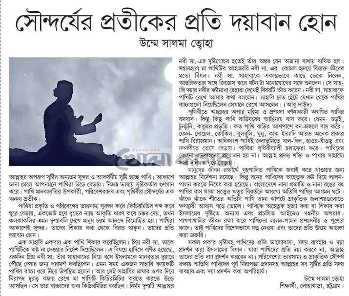 সকল প্রকার সৃষ্টিসহ পাখিদের প্রতি ভালোবাসা, সদয় ব্যবহার ও দয়া প্রদর্শন করা ইসলামের বিধান। যারা পাখিদের প্রতি দয়া করবে না, আল্লাহ তাদের প্রতি দয়া প্রদর্শন করবেন না। পরিবেশের ভারসাম্য ও প্রাকৃতিক সৌন্দর্য রক্ষায় অতিথি পাখিদের পূর্ণ নিরাপত্তা প্রদানসহ আল্লাহর সব সৃষ্টির প্রতি সদয় ব্যবহার এবং দয়া প্রদর্শন করা অপরিহার্য।