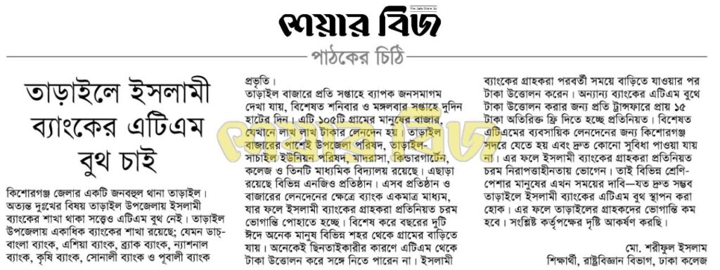 কিশোরগঞ্জ জেলার একটি জনবহুল থানা তাড়াইল। অত্যন্ত দুঃখের বিষয় তাড়াইল উপজেলায় ইসলামী ব্যাংকের শাখা থাকা সত্ত্বেও এটিএম বুথ নেই। তাড়াইল উপজেলায় একাধিক ব্যাংকের শাখা রয়েছে। উদাহরণ স্বরুপ- ডাচ বাংলা ব্যাংক, এশিয়া ব্যাংক, ব্র্যাক ব্যাংক, ন্যাশনাল ব্যাংক, কৃষি ব্যাংক, সোনালী ব্যাংক ও পূবালী ব্যাংক ইত্যাদি। তাড়াইল বাজারে প্রতি সপ্তাহে ব্যাপক জন সমাগম দেখা যায় বিশেষত শনিবার ও মঙ্গলবার সপ্তাহে দুই দিন হাটের দিন। ১০৫ টি গ্রামের মানুষের বাজার, যেখানে লাখ-লাখ টাকার লেনদেন হয়। তাড়াইল বাজারের পাশেই উপজেলা পরিষদ, তাড়াইল-সাচাইল ইউনিয়ন পরিষদ, মাদ্রাসা, কিন্ডার গার্ডেন, কলেজ, ৩ টি মাধ্যমিক বিদ্যালয় রয়েছে। এছাড়াও রয়েছে বিভিন্ন এনজিও প্রতিষ্ঠান। এই সব প্রতিষ্ঠান ও বাজারের লেনদেনের ক্ষেত্রে ব্যাংক একমাত্র মাধ্যম। যার ফলে ইসলামী ব্যাংকের গ্রাহকরা প্রতিনিয়ত চরম ভোগান্তি পোহাতে হচ্ছে। বিশেষ করে বছরের ২ টি ঈদে অনেক মানুষ বিভিন্ন শহর থেকে গ্রামের বাড়িতে যায়। অনেকেই ছিনতাই কারীর কারণে এটিএম থেকে টাকা উত্তোলন করে সঙ্গে নিতে পারে না। ইসলামী ব্যাংকের গ্রাহকরা পরবর্তীতে বাড়িতে যাওয়ার পর টাকা উত্তোলন করেন । অন্যান্য ব্যাংকের এটিএম বুথে টাকা উত্তোলন করার জন্য প্রতি ট্রান্সফারে প্রায় ১৫ টাকা অতিরিক্ত ফ্রি দিতে হচ্ছে প্রতিনিয়ত। বিশেষত এটিএমের ব্যবসায়িক লেনদেনের জন্য কিশোরগঞ্জ সদরে যেতে হয় এবং দ্রুত কোনো সুবিধা পাওয়া যায় না। যার ফলে ইসলামী ব্যাংকের গ্রাহকরা প্রতিনিয়ত চরম নিরাপত্তাহীনতায় ভোগে । তাই বিভিন্ন শ্রেণী-পেশার মানুষের এখন সময়ের দাবি, যতদ্রুত সম্ভব তাড়াইলে ইসলামী ব্যাংকে এটিএম বুথ স্থাপন করা হোক, এর ফলে তাড়াইলের গ্রাহকদের ভোগান্তি কম হবে। সংশ্লিষ্ট কর্তৃপক্ষের দৃষ্টি আকর্ষণ করছি।