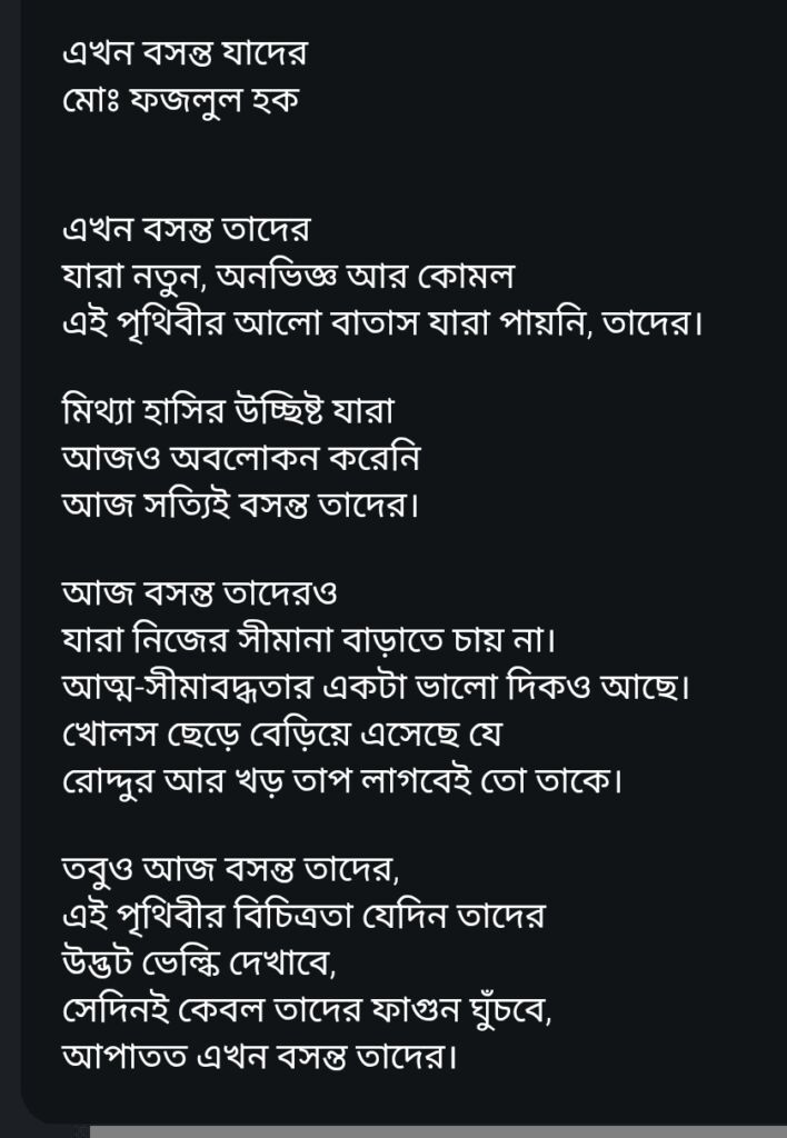 হোম / কবিতা / নিবন্ধএখন বসন্ত যাদের মোঃ ফজলুল হক , বেগম রোকেয়া বিশ্ববিদ্যালয়, রংপুর প্রকাশ: ৩ এপ্রিল ২০২৬ পাঠ: ৪৭ বার তারুণ্যের উচ্ছলতা ও বয়সের ভারের বৈপরীত্য নিয়ে লিখিত কবিতা।লেখক: সভাপতি, বেগম রোকেয়া বিশ্ববিদ্যালয়।এই লেখাটি ৩ এপ্রিল ২০২৬ তারিখে নবগ্রহ পত্রিকায় প্রকাশিত। লেখাটি শেয়ার করুন: