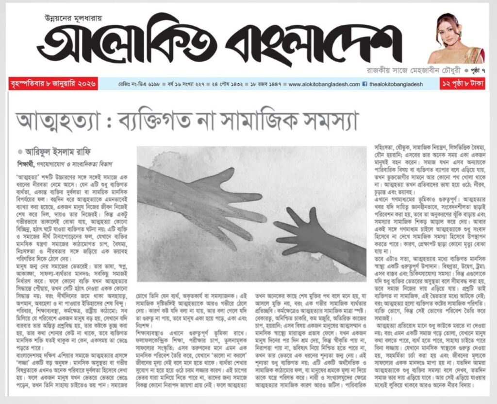 ‘আত্মহত্যা’ শব্দটি উচ্চারণের সঙ্গে সঙ্গেই সমাজে এক ধরনের নীরবতা নেমে আসে। যেন এটি কেবল ব্যক্তিগত ব্যর্থতা, একান্ত ব্যক্তির দুর্বলতা বা সাময়িক মানসিক বিপর্যয়ের ফল। বহুদিন ধরে আত্মহত্যাকে এমনভাবেই ব্যাখ্যা করা হয়েছে, একজন মানুষ নিজের জীবন নিজেই শেষ করে দিল, দায়ও তার নিজেরই। কিন্তু একটু গভীরভাবে তাকালেই বোঝা যায়, আত্মহত্যা কোনো বিচ্ছিন্ন, হঠাৎ ঘটে যাওয়া ব্যক্তিগত ঘটনা নয়; এটি ব্যক্তি ও সমাজের দীর্ঘ টানাপোড়েনের ফল, যেখানে ব্যক্তির মানসিক যন্ত্রণা সমাজের কাঠামোগত চাপ, বৈষম্য, নিঃসঙ্গতা ও নীরবতার সঙ্গে জড়িয়ে এক ভয়াবহ পরিণতির দিকে ঠেলে দেয়।