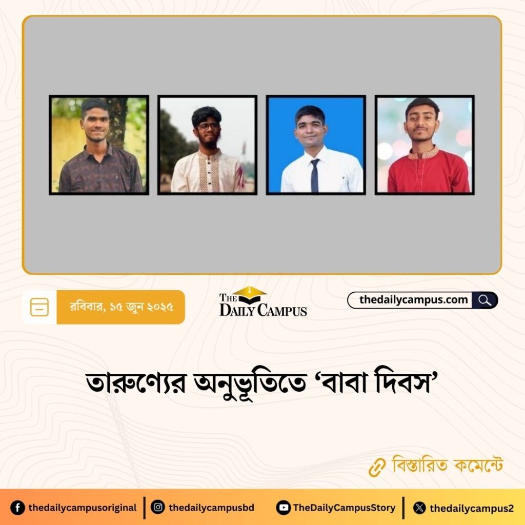 প্রতিটি সন্তানের জন্য তার এক অনন্য স্নেহের আশ্রয়স্থল হলো বাবা। জগতের সকল ক্লেশ আর গ্লানি দূর হয় যার অবয়ব দর্শনে। বাবা হলেন আমাদের জীবনের পথচলা, অনুপ্রেরণা আর ভরসার আশ্রয়স্থল। আজ ১৫ জুন (জুনের তৃতীয় রবিবার) বিশ্ব বাবা দিবস উপলক্ষ্যে বাবাকে নিয়ে নিজেদের অনুভূতি জানিয়েছেন কয়েকজন বিশ্ববিদ্যালয় শিক্ষার্থী। তাদের এ ভাবনা তুলে ধরেছেন সরকারি তিতুমীর কলেজ ইংরেজি সাহিত্য বিভাগের শিক্ষার্থী বাঁধন বৈষ্ণব।