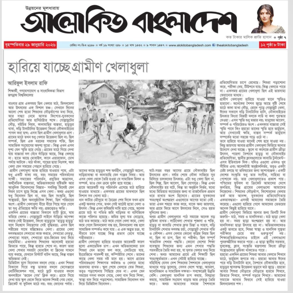 একদিন গ্রামের বাচ্চারা বিকেলে মাটি ছুঁয়ে, ঘাম ঝরিয়ে খেলত। গোল্লাছুটে লাইনে দাঁড়িয়ে অপেক্ষা করার সেই উত্তেজনা, কিংবা হাডুডুতে ‘হাডুডু হাডুডু’ বলে নিঃশ্বাস নিয়ন্ত্রণের সেই বুদ্ধিমত্তা; এসব ছিল শরীরের সাথে মস্তিষ্কেরও খেলা। গ্রামের খেলা দলবদ্ধভাবে শেখাতো কাজ করতে, শেখাতো নেতৃত্ব, শেখাতো সাহস, শেখাতো হার-জিতের মধ্য দিয়ে সহমর্মিতা। এখনকার শিশুদের অনেকেই হয়তো জিততে পারে, কিন্তু হারতে শেখে না; কারণ তারা খেলা শেখার সময়টা মোবাইল বা স্ক্রিনের সামনে ব্যয় করছে, যেখানে রিস্টার্ট বাটন আছে, কিন্তু বাস্তব অভিজ্ঞতা নেই।