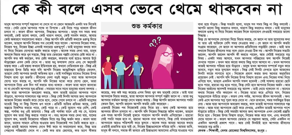 হোম / কলাম/মতামত / নিবন্ধকে কী বলে এসব ভেবে থেমে থাকবেন না শুভ কর্মকার , বেগম রোকেয়া বিশ্ববিদ্যালয়, রংপুর প্রকাশ: ১৩ এপ্রিল ২০২৬ পাঠ: ২০ বার কলামলেখক: সম্পাদকীয় পর্ষদ, বেগম রোকেয়া বিশ্ববিদ্যালয়।এই লেখাটি ১৩ এপ্রিল ২০২৬ তারিখে দৈনিক ভোরের ডাক পত্রিকায় প্রকাশিত। লেখাটি শেয়ার করুন: