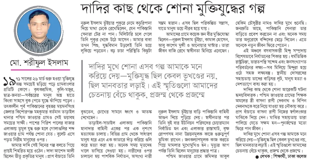 দাদির মুখে শোনা এসব গল্প আমাকে মনে করিয়ে দেয়-মুক্তিযুদ্ধ ছিল কেবল ভূখণ্ডের নয়, ছিল মানবতার লড়াই। এই স্মৃতিগুলো আমাদের চেতনায় বেঁচে থাকুক, প্রজন্ম থেকে প্রজন্মে