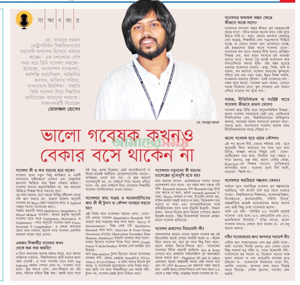 গত এক দশকেরও বেশি সময় ধরে তিনি গবেষণা, শিক্ষাদান, একাডেমিক লিডারশিপ এবং খেলাধুলার সাথে ওতপ্রোতভাবে জড়িত। তাঁর গবেষণার মূল ক্ষেত্র বা রিসার্চ ইন্টারেস্ট হলো- Entrepreneurship, HRM, Workforce Psychology, Burnout, Ethnicity এবং Higher Education in Bangladesh। তিনি বিশ্বাস করেন- “He was born to be a teacher”. তাঁর মতে, ‘গবেষণা শুধু জার্নালে ছাপানোর জন্য নয়। বরং গবেষণা মানুষকে সৎ এবং সমাজকে বুঝতে ও বদলাতে শেখায়।’ সাক্ষাৎকারটি নিয়েছেন, ‘মোফাজ্জল হোসেন’