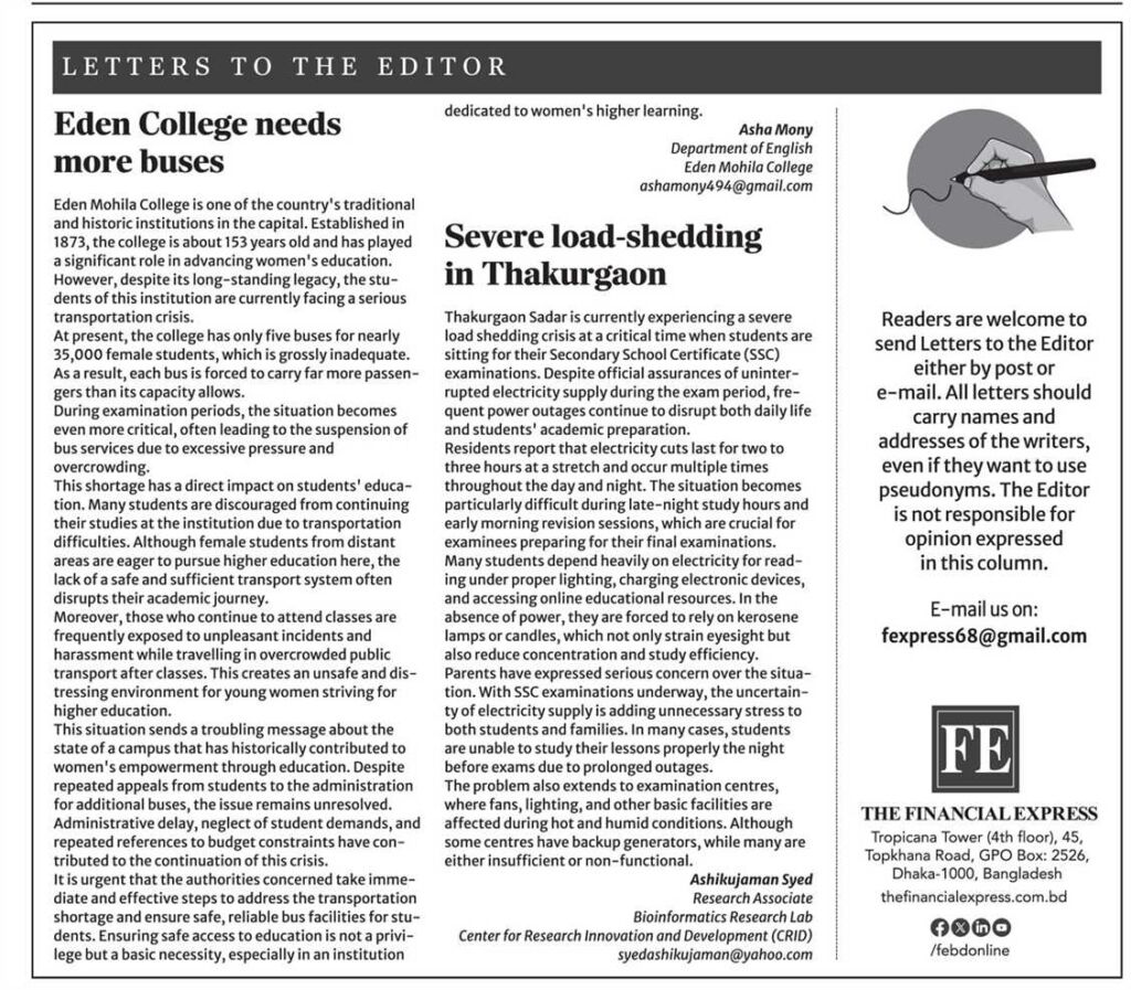 <span;>It is urgent that the authorities concerned take imme- diate and effective steps to address the transportation shortage and ensure safe, reliable bus facilities for students. Ensuring safe access to education is not a privilege but a basic necessity, especially in an institution dedicated to women’s higher learning.
