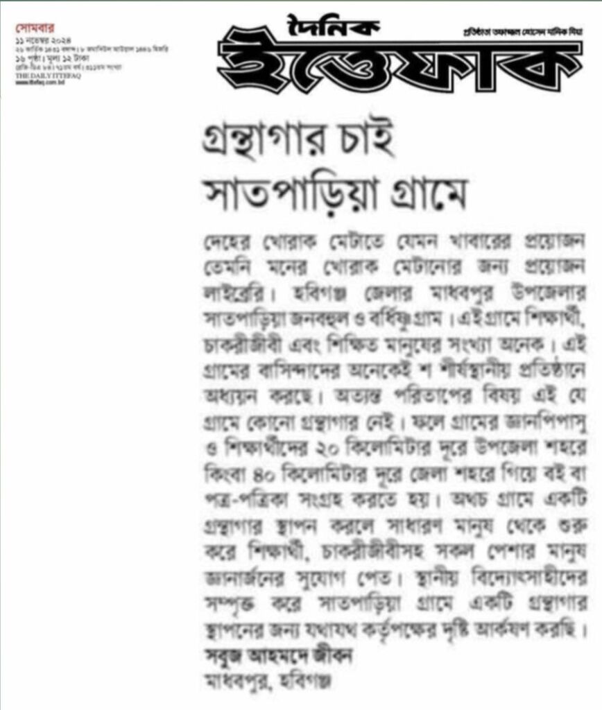 হোম / খোলা চিঠি / নিবন্ধগ্রন্থাগার চাই সাতপাড়িয়া গ্রামে সবুজ আহমেদ , রাজশাহী বিশ্ববিদ্যালয় প্রকাশ: ২৫ এপ্রিল ২০২৬ পাঠ: ২ বার নিজ গ্রামে গ্রন্থাগার চেয়ে চিঠিদৈনিক ইত্তেফাক৭ নভেম্বর, ২০২৪লেখক: সাংগঠনিক সম্পাদক, রাজশাহী বিশ্ববিদ্যালয়। লেখাটি শেয়ার করুন: