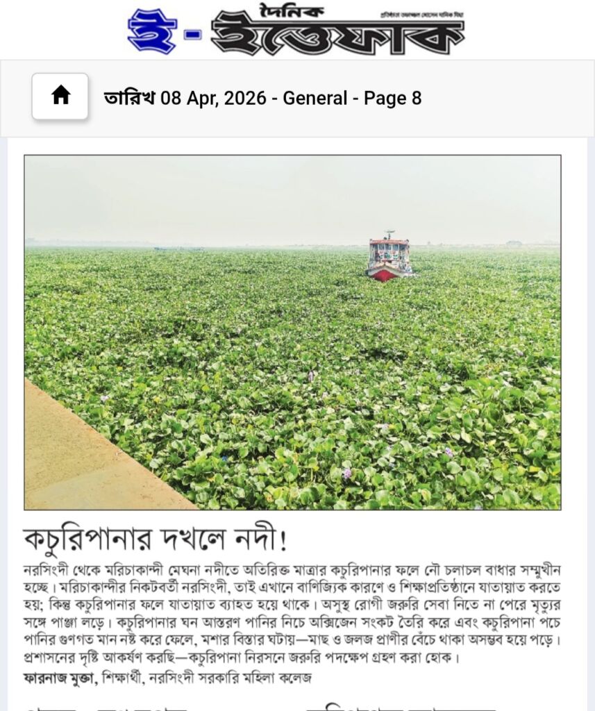 নরসিংদী থেকে মরিচাকান্দি মেঘনা নদীতে অতিরিক্ত মাত্রার কচুরিপানার ফলে নৌ চলাচল বাধার সম্মুখীন হচ্ছে। মরিচাকান্দির নিকটবর্তী নরসিংদী, তাই এখানে বাণিজ্যিক কারণে ও শিক্ষাপ্রতিষ্ঠানে যাতায়াত করতে হয়; কিন্তু কচুরিপানার ফলে যাতায়াত ব্যাহত হয়ে থাকে। অসুস্থ রোগী জরুরি সেবা নিতে না পেরে মৃত্যুর সঙ্গে পাঞ্জা লড়ে। কচুরিপানার ঘন আস্তরণ পানির নিচে অক্সিজেন সংকট তৈরি করে এবং কচুরিপানা পচে পানির গুণগত মান নষ্ট করে ফেলে, মশার বিস্তার ঘটায়—মাছ ও জলজ প্রাণীর বেঁচে থাকা অসম্ভব হয়ে পড়ে। প্রশাসনের দৃষ্টি আকর্ষণ করছি—কচুরিপানা নিরসনে জরুরি পদক্ষেপ গ্রহণ করা হোক।