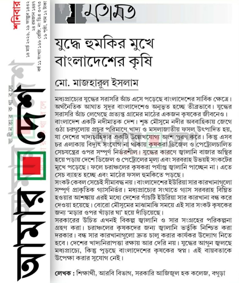 মধ্যপ্রাচ্যের যুদ্ধে বাংলাদেশের কৃষি হুমকির মুখে